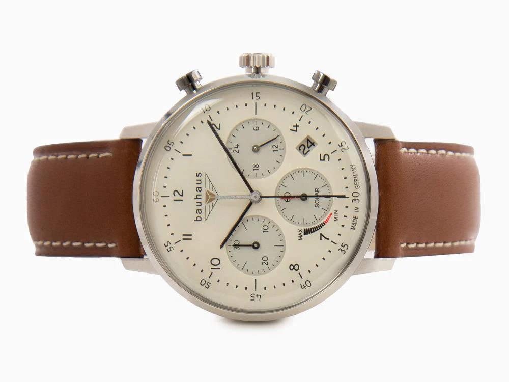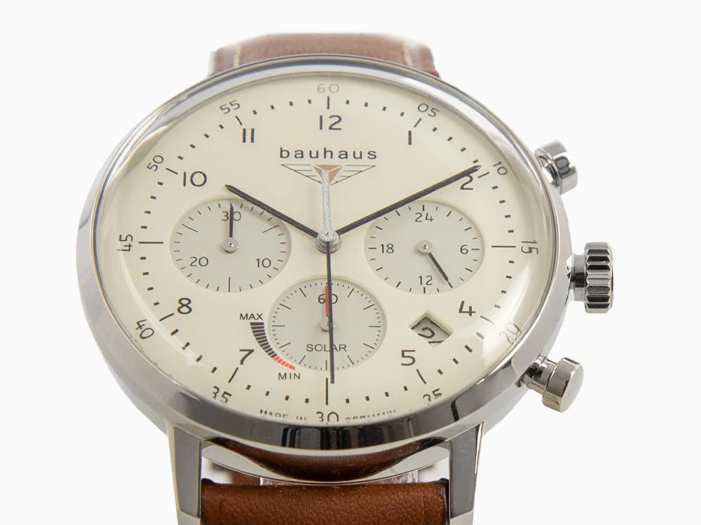Besonders hervorzuheben ist die intuitive Bedienbarkeit. Die klar strukturierte Anordnung der Anzeigen auf dem beigen Zifferblatt sorgt dafür, dass Sie alle Messwerte schnell erfassen können. In Kombination mit der hohen Ablesbarkeit wird die Chronographenfunktion zu einem echten Mehrwert. Die solarbetriebene Designer Uhr Bauhaus 2086-5 für Herren verbindet somit Funktionalität mit Nutzerfreundlichkeit auf höchstem Niveau.