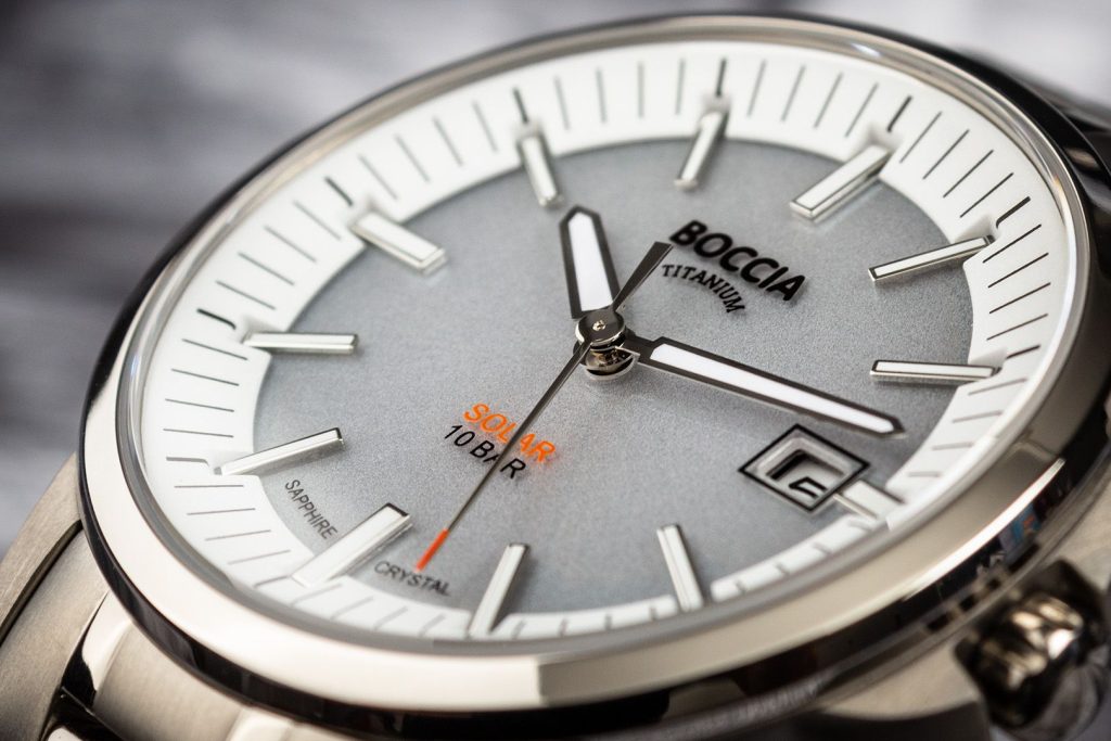 Das zweiteilige Zifferblatt der BOCCIA Titanium 3643-03 kombiniert eine weiße Minuterie mit einem silbergrauen Zentrum, wodurch ein klarer Kontrast entsteht. Diese Gestaltung verbessert die Ablesbarkeit erheblich und sorgt gleichzeitig für eine elegante Tiefenwirkung. Linienindizes strukturieren die Anzeige zusätzlich und unterstützen eine schnelle Orientierung. Funktionales Design bedeutet hier, dass Ästhetik und Nutzwert ineinandergreifen. Die Datumsanzeige mit Schnellkorrektur-Funktion ergänzt die Alltagstauglichkeit und erhöht den praktischen Nutzen. Gute Ablesbarkeit ist nicht nur Komfort, sondern auch ein Sicherheitsfaktor – etwa beim schnellen Erfassen der Zeit im Straßenverkehr oder bei Terminen.