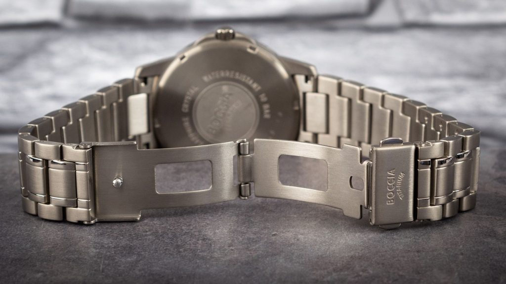 Die BOCCIA Titanium 3643-03 ist mit einer flach bauenden Doppeldrücker-Faltschließe aus Titan ausgestattet, die sowohl ergonomische als auch sicherheitstechnische Vorteile bietet. Der Doppeldrückermechanismus verhindert ein unbeabsichtigtes Öffnen, da zum Lösen der Schließe zwei seitliche Drücker gleichzeitig betätigt werden müssen. Gleichzeitig ermöglicht die Konstruktion ein komfortables An- und Ablegen der Uhr mit nur wenigen Handgriffen. Die geringe Bauhöhe sorgt dafür, dass die Schließe nicht aufträgt und sich harmonisch in das Gesamtbild integriert. Gerade im Berufsalltag oder bei sportlichen Bewegungen ist ein sicherer Verschluss essenziell. Komfort entsteht hier durch intelligente Mechanik und durchdachtes Design.