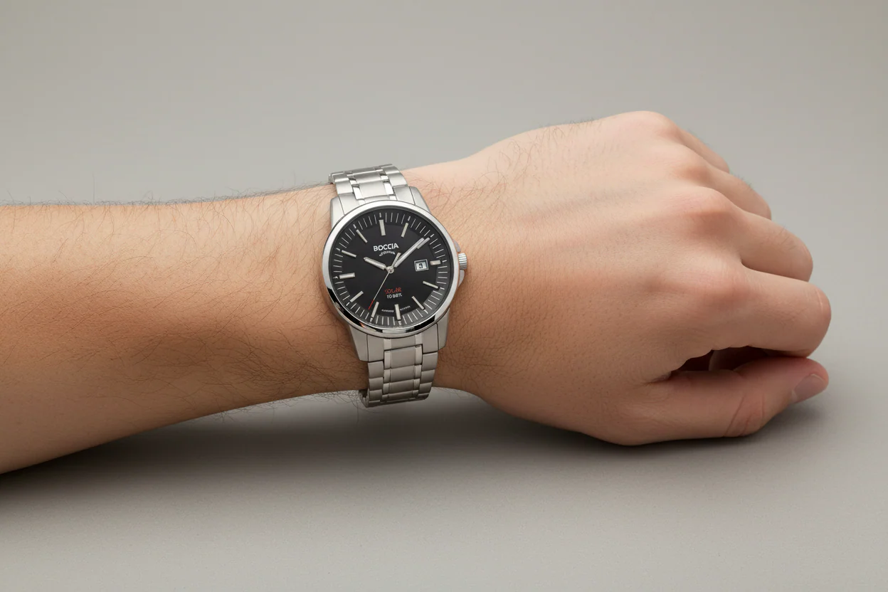 Die BOCCIA Titanium 3643-03 kombiniert funktionale Konstruktion mit anspruchsvoller Ästhetik durch teilpolierte Armbandoberflächen. Polierte Elemente erzeugen Lichtreflexe, die Wertigkeit und Eleganz vermitteln, während satinierte oder mattierte Bereiche eine dezente, moderne Optik schaffen. Diese Mischung unterschiedlicher Oberflächenbearbeitungen erhöht nicht nur die visuelle Tiefe, sondern verbessert auch die Alltagstauglichkeit, da matte Bereiche weniger anfällig für sichtbare Gebrauchsspuren sind. Die Kombination aus polierter Lünette, satiniertem Gehäuse und teilpoliertem Band erzeugt ein harmonisches Gesamtbild, das sowohl im Businessumfeld als auch in der Freizeit überzeugt. Für viele Käufer stellt sich die Frage, ob eine Uhr eher sportlich oder elegant wirken soll. Durch die hybride Oberflächenstruktur vereint dieses Modell beide Eigenschaften und schafft damit einen vielseitigen Stil.