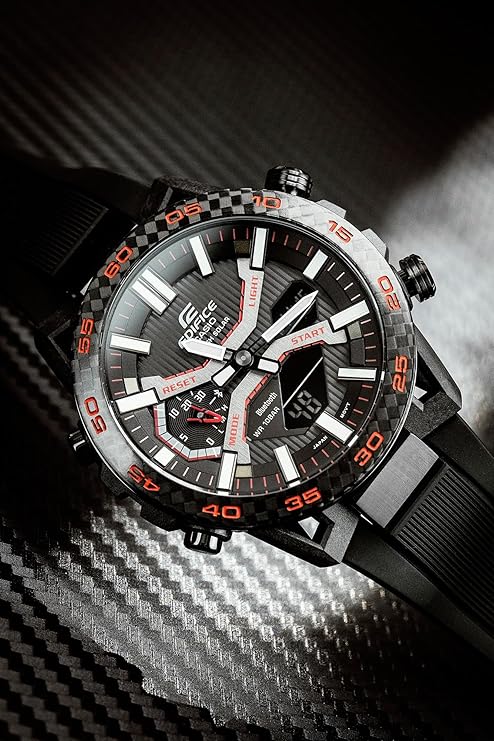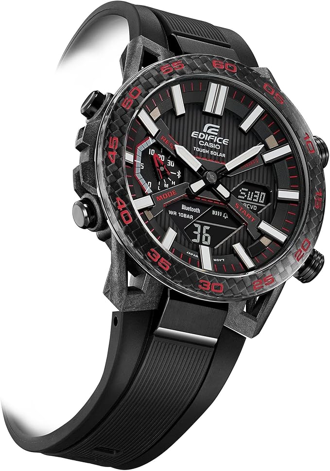 Mit ihrer Analog-Digital-Struktur bietet die Uhr sowohl klassische Eleganz als auch moderne Funktionalität. Das widerstandsfähige Karbongehäuse, das in dieser Form erstmals bei einer Edifice-Uhr eingesetzt wurde, sorgt für Leichtigkeit und Robustheit. Über die CASIO WATCHES App lässt sich die Uhr via Bluetooth® mit dem Smartphone verbinden, was automatische Zeiteinstellungen, Datenübertragungen und komfortable Steuerungsoptionen ermöglicht.