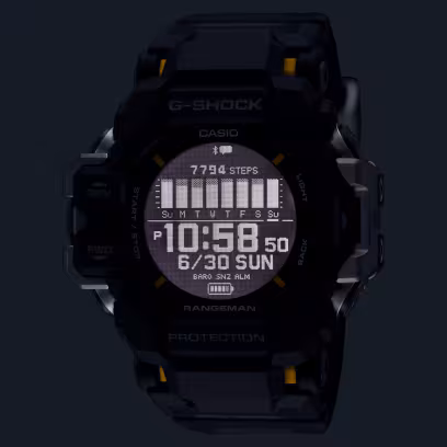 Der Super Illuminator in Weiß optimiert die Nacht- und Schlechtwetterlesbarkeit. Die Casio G-SHOCK Master of G Rangeman GPR-H1000-1ER bietet damit eine operative 24/7-Nutzbarkeit – ohne Abstriche bei Komfort oder Energieeffizienz.