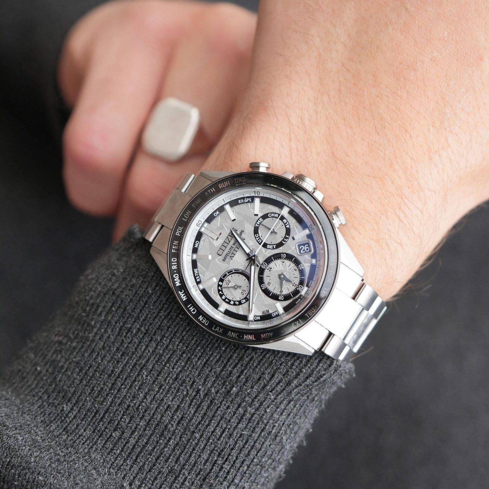 Die Lünette der Citizen Attesa Satellite Wave CC4076-65A ist mehr als nur ein optisches Detail – sie ist ein funktionales Steuerungselement. Aus kratzfestem, schwarz beschichtetem Titan gefertigt, trägt sie gravierte Städtecodes, die für die 27 Metropolen der Weltzeitfunktion stehen. Damit symbolisiert die Lünette die globale Reichweite der Uhr und macht sie zu einem echten Begleiter für internationale Geschäftsreisen.