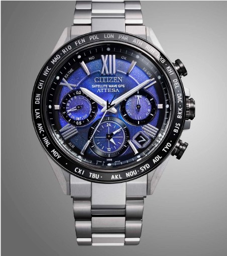 Das Zifferblatt der Citizen Attesa Satellite Wave GPS CC4075-50L nutzt pigmentfreie Farbschichten, deren Mikrostrukturen Licht reflektieren und dadurch eine Vielzahl von Blautönen erzeugen. So entsteht ein faszinierendes Spiel aus Tiefe und Leuchtkraft, das den Betrachter unweigerlich an das endlose Blau des Ozeans erinnert.
