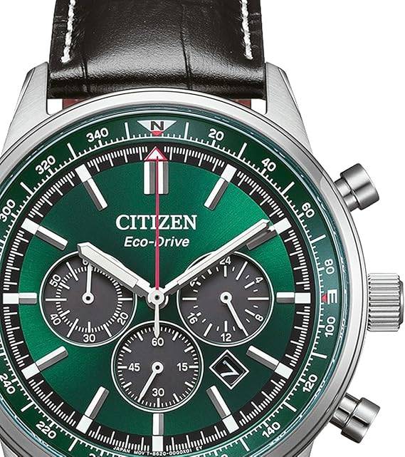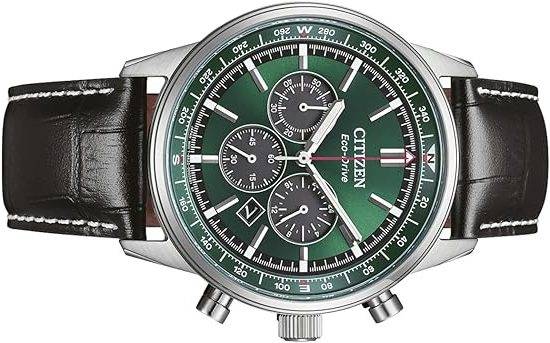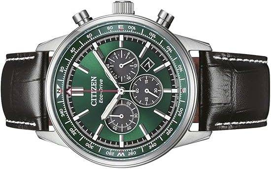 Die solarbetriebene Designer Uhr Citizen Classic Eco-Drive CA4720-01X für Herren kombiniert klassische Chronographenarchitektur mit einem grünen Sunray-Zifferblatt und schwarzem Lederband – eine Farbkombination, die aktuell als besonders hochwertig und zeitgemäß wahrgenommen wird.