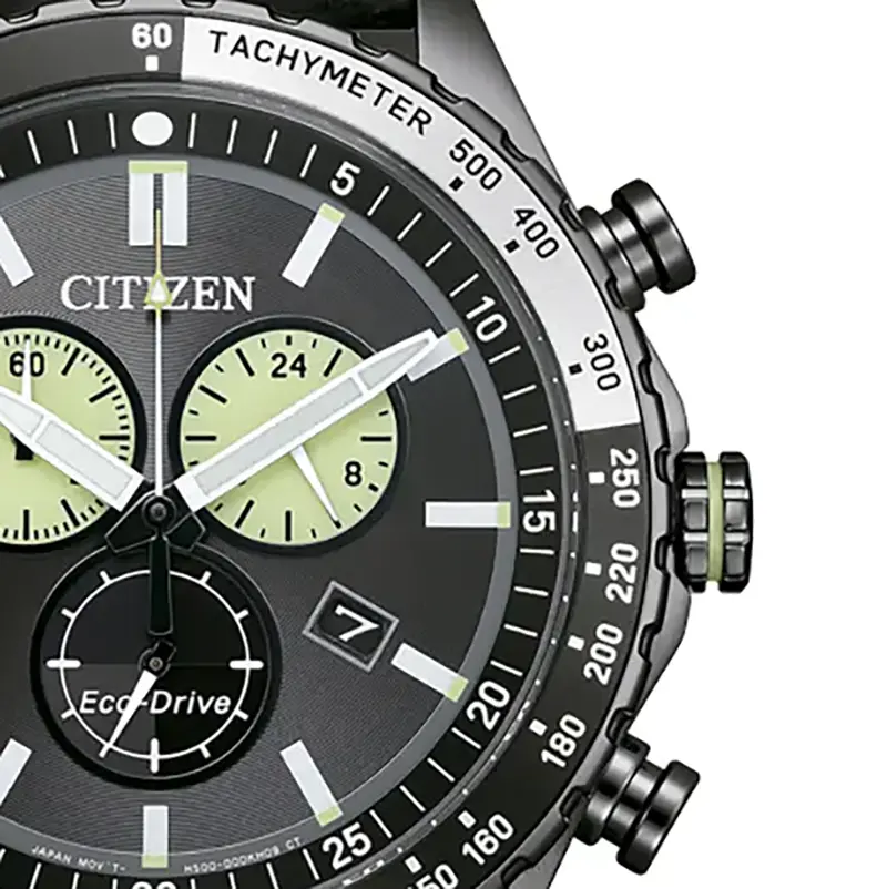 Im Inneren der solarbetriebenen Designer Uhr Citizen Eco-Drive AT2565-05E für Herren arbeitet das Kaliber H500-00Z – ein analoges Chronographenwerk mit umfangreicher Funktionalität. Ein Chronograph ist mehr als eine Stoppuhr: Er erlaubt präzise Zeitmessungen bis 60 Minuten in 1/1-Sekunden-Schritten und erweitert die Uhr um einen echten Nutzwert. Ergänzt wird dies durch eine 24-Stunden-Anzeige, eine Datumsfunktion und einen integrierten Tachymeter zur Geschwindigkeitsmessung.