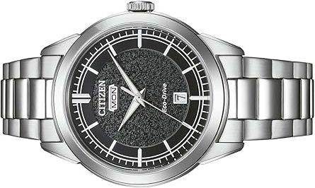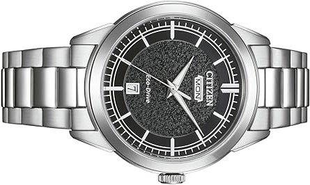 Die Citizen Eco-Drive AW0151-85EC ist eine klassische Dress Watch mit rundem Edelstahlgehäuse in Silber, schwarzem Zifferblatt mit feiner Struktur und klaren Strichindizes. Lumineszierende Zeiger und Indizes verbessern die Ablesbarkeit bei schlechten Lichtverhältnissen, während ein zentraler Sekundenzeiger präzise Zeitinformation liefert. Die Day-Date-Anzeige auf 6 Uhr (Datum) und 12 Uhr (Wochentag) stellt ein differenzierendes Designmerkmal dar. Mit 40,5 mm Durchmesser und 117 g Gewicht wirkt die Uhr präsent, aber nicht dominant. Die Designphilosophie folgt dem Prinzip „zeitlose Eleganz trifft funktionale Innovation“, wodurch eine hohe Einsatzflexibilität entsteht.