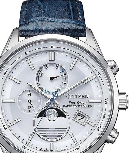 Im Zentrum der Citizen Eco-Drive BY1030-09A mit Funk steht die Harmonie zwischen Funktion und Klarheit. Bei 6 Uhr befindet sich die faszinierende Mondphasenanzeige – ein Feature, das nicht nur ästhetisch begeistert, sondern auch astronomische Präzision widerspiegelt. Auf 9 Uhr ist die 24-Stunden-Anzeige platziert, während bei 12 Uhr die kombinierte Wochentags- und Ladezustandsanzeige positioniert ist. Das Datumsfenster bei 4 Uhr rundet die visuelle Symmetrie ab.
