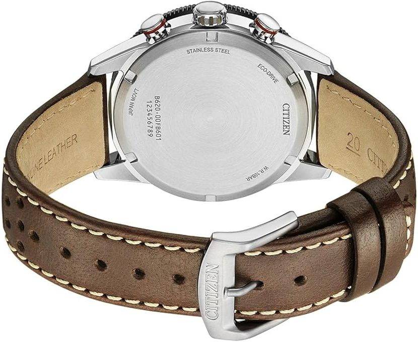 Das Armband ist ein zentrales Element für den täglichen Nutzen einer Uhr, und bei der solarbetriebenen Designer Uhr Citizen Eco-Drive CA4714-04A für Herren wurde diesem Aspekt besondere Aufmerksamkeit geschenkt. Das braune Lederarmband im sportlich inspirierten Racing-Look verbindet klassische Uhrentradition mit moderner Dynamik. Leder als Naturmaterial passt sich im Laufe der Zeit dem Handgelenk an und entwickelt eine individuelle Patina, die den persönlichen Charakter der Uhr zusätzlich unterstreicht.
