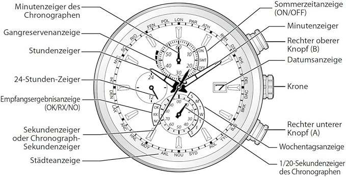 KaliberfunktionenEwiger Kalender; Stoppuhr: max. 60 min, 1/20 sek; Eco-Drive; Anzeige der Energiereserve; Tag/Datum; Anzeige der Batterieentladung; Antimagnetisch; 24h Anzeige; Ortszeit für 26 Städte; ±15 Sek. pro Monat ohne Funknutzung; Weltzeit; Energiesparmodus; Funkuhr – EUR, JPY, USA, China; Zeitzonen abrufbar