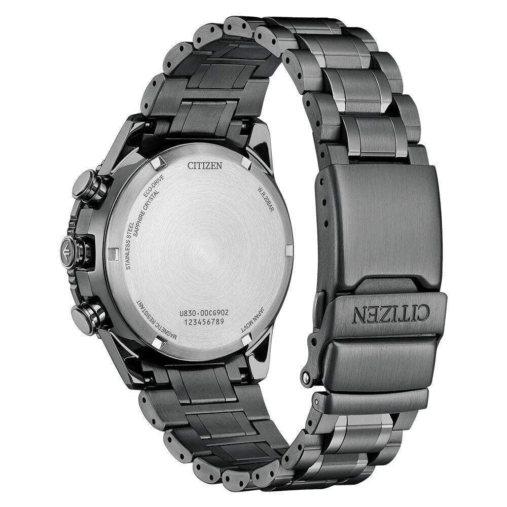 Das Armband der Citizen Promaster Sky JV2005-58E ist ebenso durchdacht wie das Uhrwerk selbst. Gefertigt aus massivem Edelstahl mit IP-Grau-Oberfläche, bietet es Stabilität und Tragekomfort in perfekter Balance. Die ergonomische Gliederstruktur passt sich ideal an das Handgelenk an, während die Faltschließe mit Sicherheitsverriegelung und Doppeldruckknopf maximalen Halt bietet.
