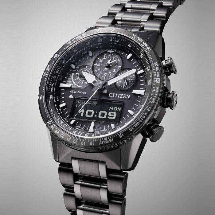 Dank MIP-Technologie (Memory-in-Pixel-Display), entspiegeltem Saphirglas und kräftiger Lumineszenz überzeugt die solarbetriebene Designer Uhr Citizen Promaster Sky JV2005-58E für Herren bei allen Lichtbedingungen. Bei starker Sonneneinstrahlung bleibt der Kontrast stabil, während in der Dunkelheit das LED-Licht und die nachleuchtenden Zeiger für perfekte Lesbarkeit sorgen. So bleibt die Anzeige bei Tag wie Nacht gestochen scharf. - Die Rechenschieber-Lünette klingt spannend – wozu ist sie wirklich gut?
