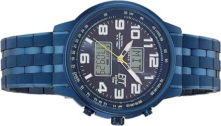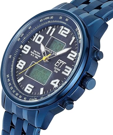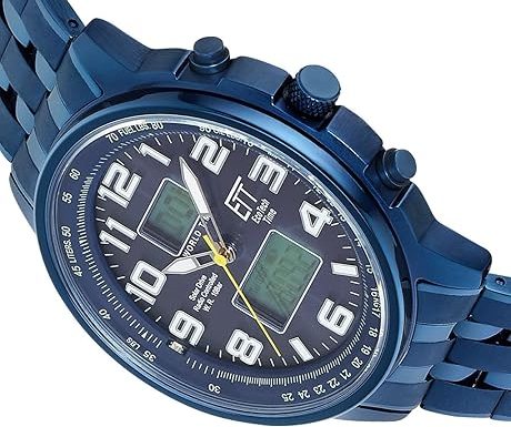 Im direkten Benchmarking sticht die solarbetriebene Designer Uhr ETT Eco Tech Time Hunter II EGS-11735-32M für Herren durch ihre moderne, blau ionisierte Edelstahloptik sofort hervor. Während viele Konkurrenzmodelle auf klassische Silber- oder Schwarzvarianten setzen, liefert die Hunter II ein visuelles Differenzierungsmerkmal, das im Markt für Solar-Funkuhren ein klares Alleinstellungsprofil erzeugt. Die Kombination aus blauem Edelstahlgehäuse, sportlichem gelbem Sekundenzeiger und analog-digitalem Hybrid-Display adressiert Nutzer, die ein markantes, aber gleichzeitig seriöses Design bevorzugen. Konkurrenzprodukte – insbesondere Citizen Eco-Drive oder Casio Wave Ceptor – bleiben häufig stärker im funktionalen Look verankert und verzichten auf kontraststarke farbliche Akzente. Für modebewusste Business Professionals und sportlich aktive Zielgruppen bietet die Hunter II daher eine signifikante visuelle Mehrwertdimension.