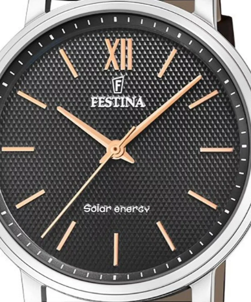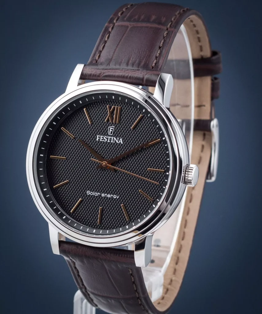Die solarbetriebene Designer Uhr Festina F20660/6 für Herren richtet sich primär an business-orientierte Männer, die Wert auf ein gepflegtes, professionelles Erscheinungsbild legen. Das schwarze Zifferblatt, das schlanke Edelstahlgehäuse und das braune Lederarmband harmonieren ideal mit Anzug, Sakko oder Business-Casual-Outfits.