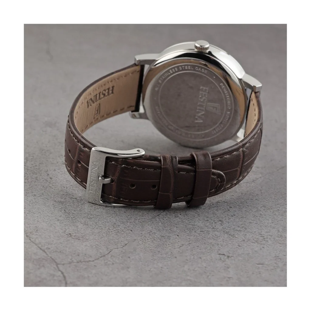 Ein entscheidendes Gestaltungselement der Festina F20660/6 ist das braune Lederarmband. Es schafft einen warmen, stilvollen Kontrast zum kühlen Edelstahlgehäuse und dem dunklen Zifferblatt. Diese Kombination verleiht der Uhr ihre Vielseitigkeit: Sie passt gleichermaßen zum Business-Outfit wie zur gehobenen Freizeitgarderobe.