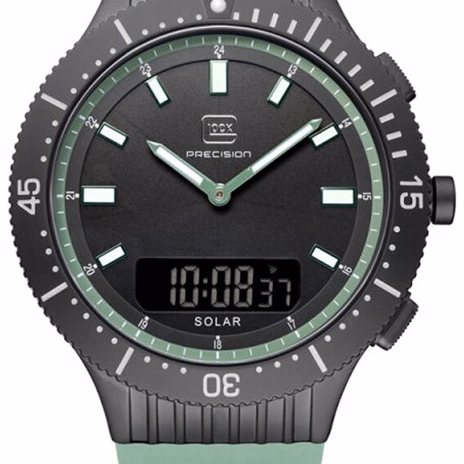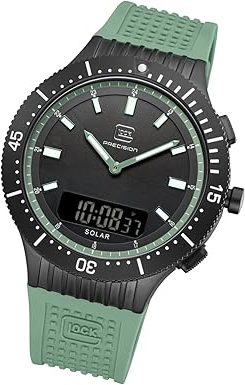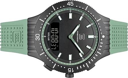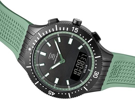 Die solarbetriebene Designer Uhr Glock Precision GW-40-2-24 für Herren kombiniert ein Solar-Hybrid-Uhrwerk mit analoger und digitaler Anzeige, Chronograph, drehbarer Lünette sowie Swiss Super-LumiNova®. Diese Kombination ist in dieser Form selten und bietet eine hohe Funktionsvielfalt bei gleichzeitig nachhaltiger Energieversorgung.