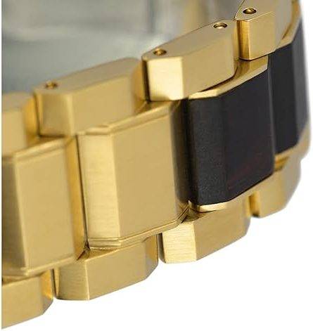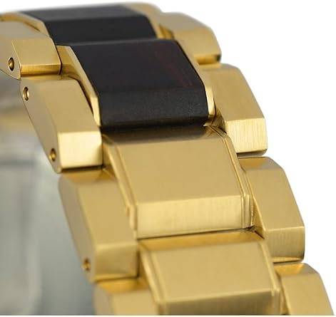 Das Armband in Braun-Gold ist perfekt auf das Gehäusedesign abgestimmt. Die warmen Holznuancen harmonieren mit der goldfarbenen Edelstahlstruktur und dem ebenso braunen Zifferblatt der Uhr. Dadurch entsteht ein eleganter, in sich geschlossener Look, der sowohl zu Business-Outfits als auch zu smart-casual Styles passt.