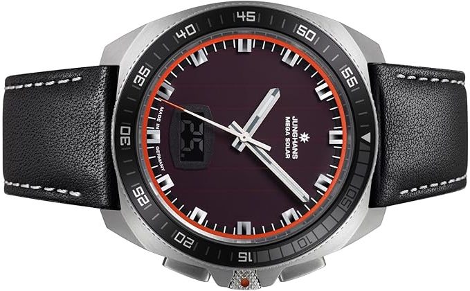 Die solarbetriebene Designer Uhr Junghans 1972 Mega Solar 56/4610.00 für Herren kombiniert eine klassische analoge Zeitanzeige mit digitalen Zusatzinformationen – ein hybrides Konzept, das strategisch auf maximale Informationsdichte und Nutzerfreundlichkeit ausgelegt ist.