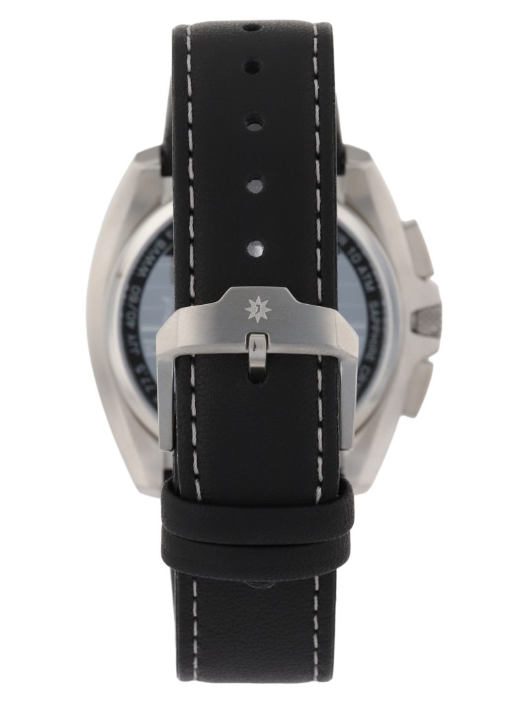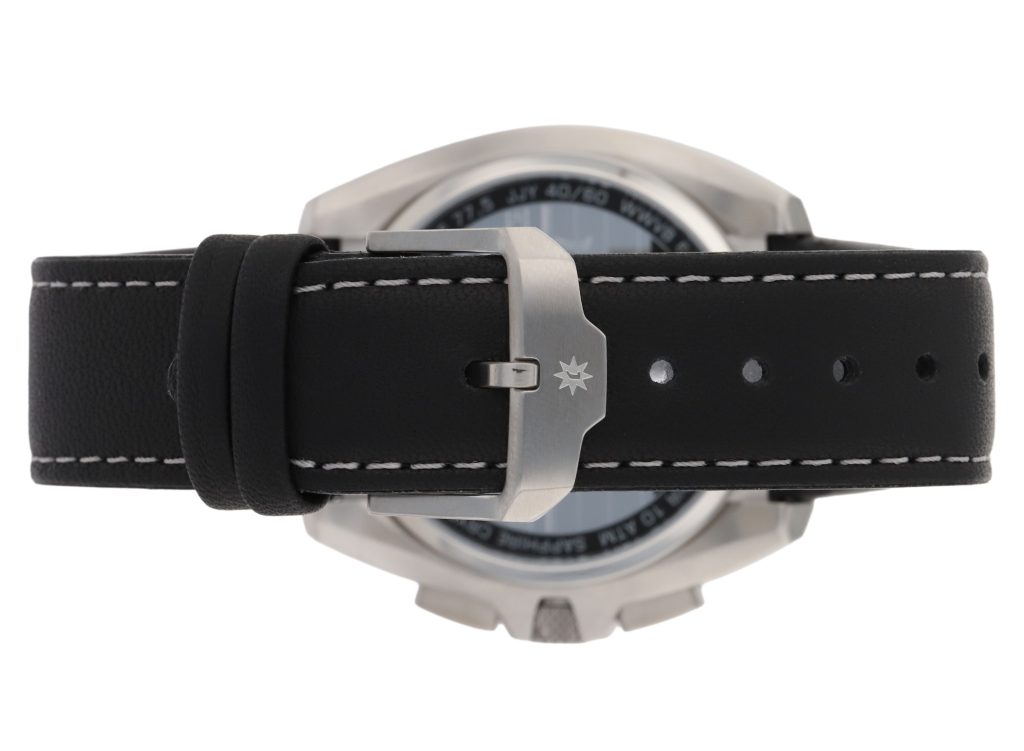 Die Junghans 1972 Mega Solar 56/4610.00 wird primär mit einem schwarzen Lederarmband geliefert, das durch hellgraue Nähte und eine matte Dornschließe mit Logo ergänzt wird. Alternativ existiert eine Variante mit Edelstahlband und Faltschließe.