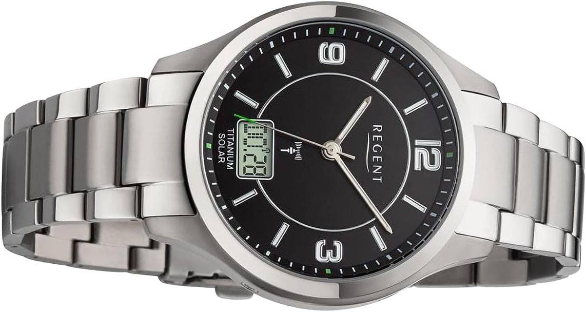 Mit ihrem robusten Titangehäuse, dem silberfarbenen Titanarmband und dem tiefschwarzen Zifferblatt bildet die Regent BA-715 eine harmonische Symbiose aus Understatement und technischer Raffinesse. Das analog-digitale Laufwerk mit digitaler Datumsanzeige auf sechs Uhr unterstreicht die Verbindung zwischen klassischer Anzeigelogik und moderner Funktionalität. Die Kombination von Solarbetrieb und Funksteuerung sorgt dafür, dass die Uhr jederzeit präzise läuft – ohne dass ein Batteriewechsel nötig wird.