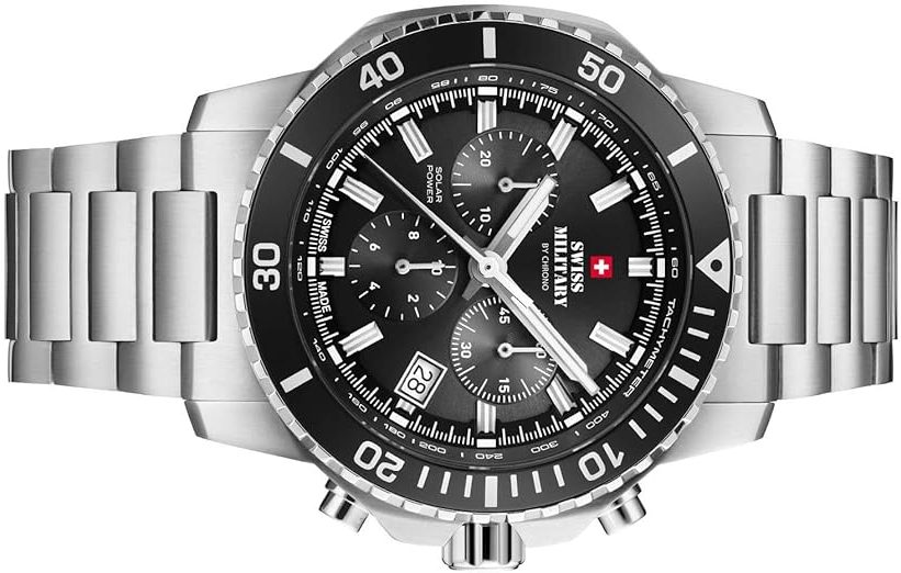 Ja, die gibt es. Wenn Sie ultraleichte Uhren bevorzugen oder ein sehr minimalistisches Design ohne Zusatzfunktionen suchen, könnte die solarbetriebene Designer Uhr Swiss Military by Chrono SMS34113.01 für Herren etwas „zu präsent“ wirken. Auch der Preis liegt über Einstiegsmodellen.