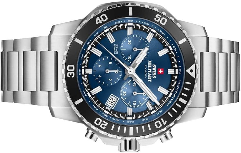 Die solarbetriebene Designer Uhr Swiss Military by Chrono SMS34113.02 für Herren überzeugt als strategisch durchdachte Kombination aus nachhaltiger Energieversorgung, Schweizer Präzision und markantem Design. Mit ihrem Solar-Quarzwerk entfällt der Batteriewechsel vollständig, während eine Gangreserve von mehreren Monaten maximale Betriebssicherheit gewährleistet. Hochwertige Materialien wie 316L-Edelstahl und kratzfestes Saphirglas sichern Langlebigkeit, während 100 Meter Wasserdichtigkeit und Chronographenfunktion echte Alltagstauglichkeit bieten. Ergänzt durch Swiss Made Qualität, Handmontage und 5 Jahre Garantie entsteht ein Premium-Zeitmesser mit klarem Mehrwert für anspruchsvolle Nutzer.