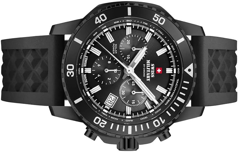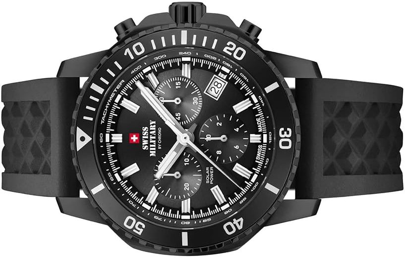 Die Kombination aus Chronograph und Solartechnologie macht die Swiss Military by Chrono SMS34113.05 zu einem vielseitigen Instrument, das weit über die reine Zeitanzeige hinausgeht.